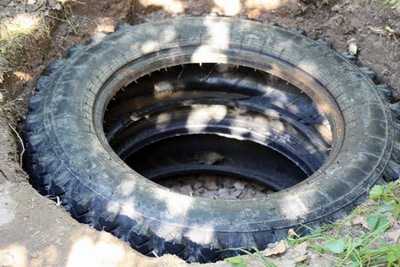 Сооружение сливной ямы можно сделать даже из автопокрышек