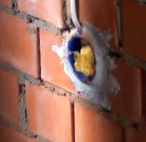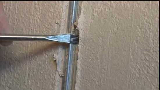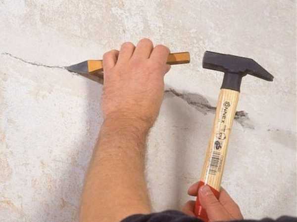 - Если ширина расхождения трещины невелика, но очевидно, что она уходит в глубину стены, первое, что нужно сделать — это расширить ее, и освободить доступ к узкой части в толще материала.