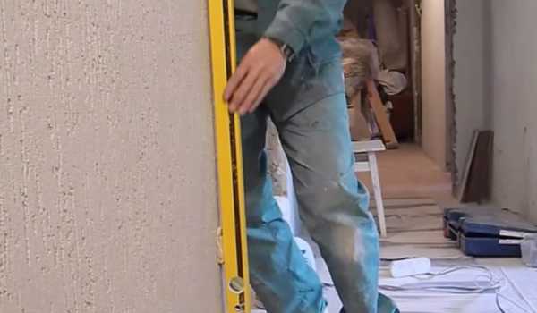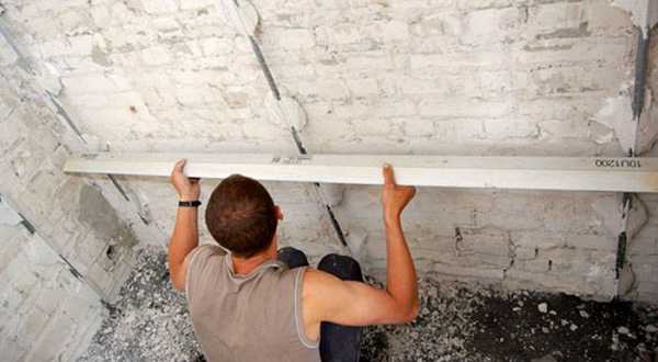 - Если в наборе инструментов имеется только короткий уровень, тогда можно использовать длинный брусок, который приставляют к направляющей, до того, как полностью высохнет раствор гипса. К его середине ставят уровень и по нему ровняют одну или другую сторону направляющей, осторожно прижимая ее бруском.