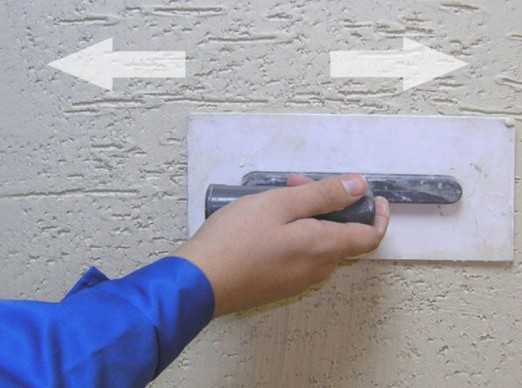 После нанесения штукатурки делается затирка. Штукатурка при этом, используется более жидкая и лучше если стена не совсем высохла. Раствор наносится на малку и размазывается тонким слоем. Когда стена высохнет, следует пройтись деревянной тёркой и в завершении отшлифовать поверхность прикрепив к тёрке фетр.