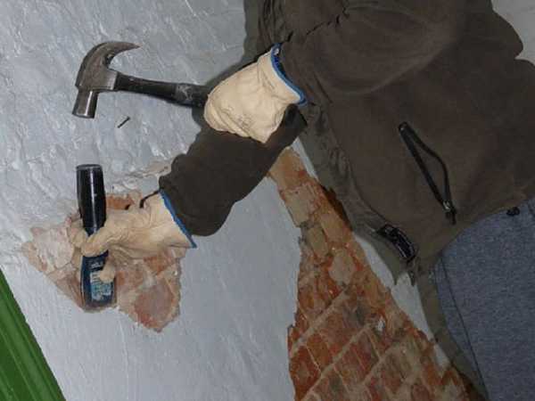 Для этого один из участков стены вначале простукивается молотком. Затем через появившиеся трещины отслоившаяся от ударов штукатурка подцепляется шпателем. При необходимости по его ручке постукивают молотком, отделяя слои штукатурки от стены.