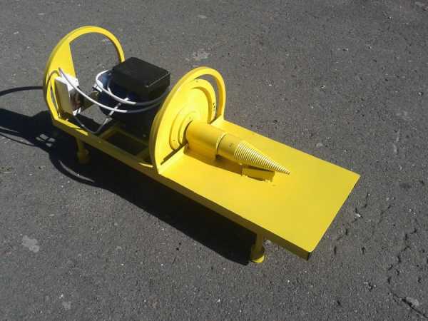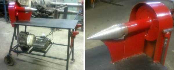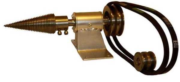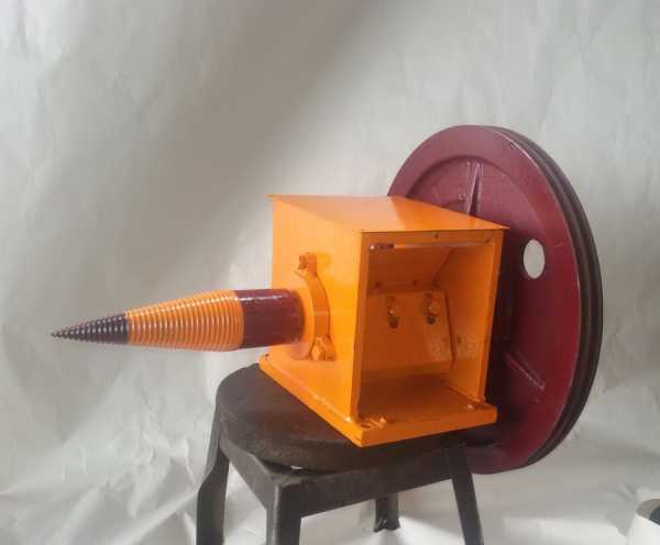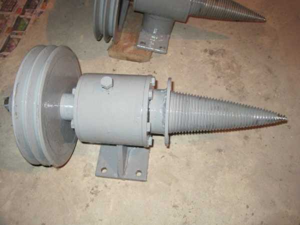 Дровокол-шуруп менее известная модель, но по простоте конструкции и пользования быстро набирает популярности. Устройство состоит из двигателя, закрепленного на станине. Рабочий конус закреплен на вале, который при работе вращается с помощью редуктора.