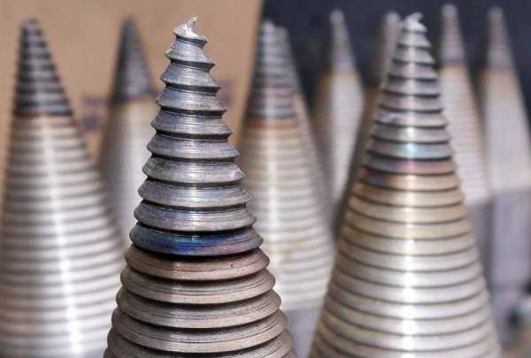 Сначала режущую часть вытачивали в виде гладкого конуса. Если использовать гладкий конус, при работе приходится довольно сильно налегать на чурбак, чтобы цилиндр «вгрызался» в древесину. Намного легче идет процесс, если на его поверхности нарезана резьба. В таком случае чурбак как-бы накручивается на винт, а потом раскалывается.