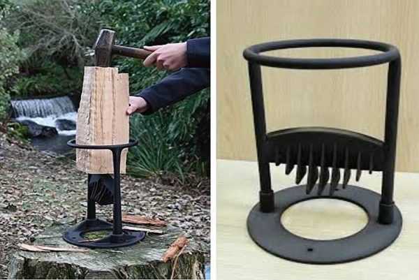 - Если изготовить нож-клин крестообразной формы, то он будет раскалывать бревно сразу на четыре части. Такие агрегаты значительно облегчают работу с толстыми поленьями и древесиной с переплетёнными волокнами.
