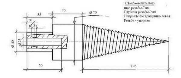 Чертеж с размерами конуса с резьбой для винтового дровокола