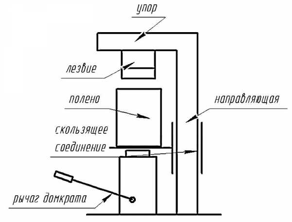 Самым простым гидравлическим дровоколом является конструкция, состоящая из вертикальной рамы на платформе, внизу которой находится автомобильный домкрат.
