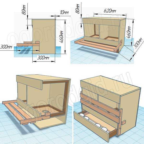 - Внизу устанавливают выдвижной лоток, в котором будут скапливаться яйца. Его низ делают сетчатым и под углом, а по бокам приклеивают поролоновые ленты, чтобы скатившиеся яйца не разбились.