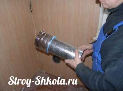 Более сложным является установка вытяжной трубы. Прежде всего, потребуется асбестовая или пластиковая труба, диаметром в 100 мм. Не используйте стальные, чугунные или жестяные, алюминиевые трубы под вытяжку. Лучше всего подойдет асбестоцемент или стеклопластик, на худой конец обычную канализационную пластиковую трубу, усиленную обмоткой на пенополиуретановой пене. Про металл забудьте и выкиньте из головы. В стальной трубе воздух очень быстро остывает, и тяга падает почти в два раза. В зимнее время можно легко получить обратную тягу или удар, когда холодный воздух пойдет внутрь помещения через вытяжной канал.