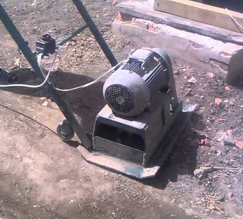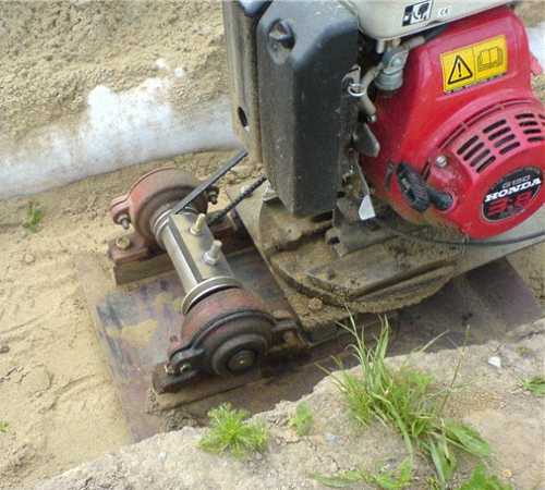 Эластичные подушки нужно устанавливать у основания плиты, где закрепляется рукоятка управления. Это поможет погасить вибрацию, инструмент из рук вырываться не будет. Затем привариваются колеса и полая труба, чтобы облегчить транспортировку инструмента.