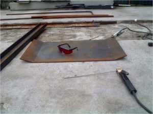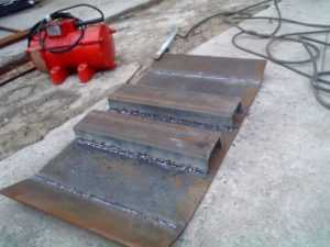 В первую очередь изготавливается рабочая площадка. Края листового металла необходимо загнуть на 30 40 градусов относительно земли. Для этого поверхность пластины нужно надпилить в 10 сантиметрах от края, глубиной не более половины её толщины. Затем согнуть по линии надреза молотком. Швы на местах сгибов необходимо обварить для жёсткой фиксации. Такая конструкция подошвы позволит будущей виброплите скользить по поверхности, а не зарываться в неё.