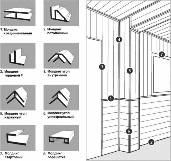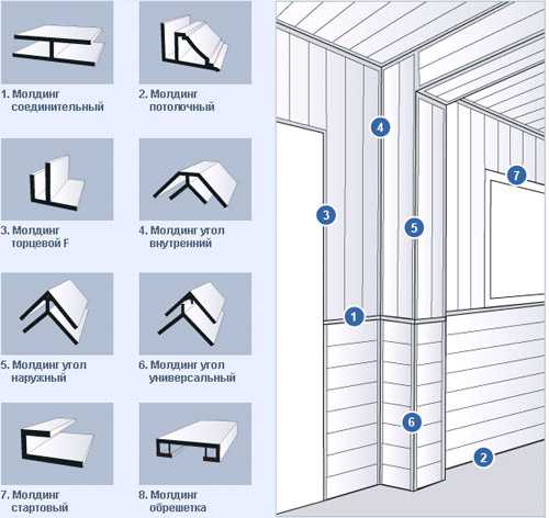 Следующий этап после монтажа обрешетки — установка направляющих, которые скрывают стыки, и фурнитуры. Для крепежа направляющих деталей также можно использовать гвозди, монтажные скрепы и саморезы. Стык с полом необходимо закрыть пластиковым плинтусом, а стык с потолком оформляем молдингом для потолочного карниза.