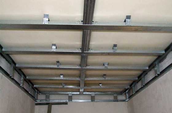 - Металлические несущие элементы закрепляются в направляющий профиль при помощи коротких саморезов и фиксируются в установленных подвесах.