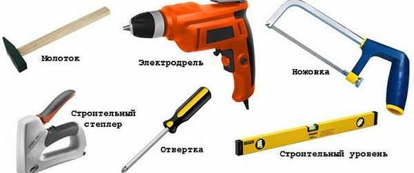 - Рулетка, пила с мелкими зубчиками или лобзик, уголок, дрель-перфоратор, шуруповерт или отвертка, уровень, нож-резак, карандаш и степлер;