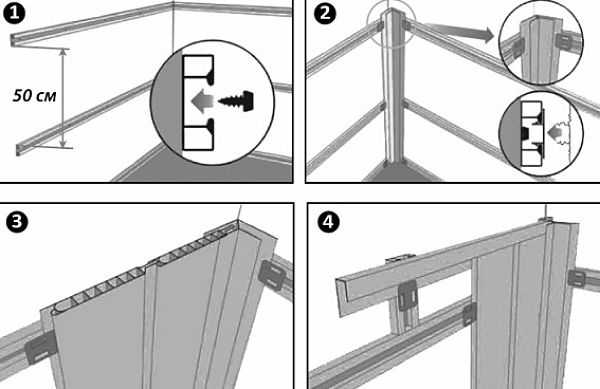 Установка происходит следующим образом: панель нужно вставить в боковой профиль, который укрепляют с задней стороны с помощью каркасной рейки.