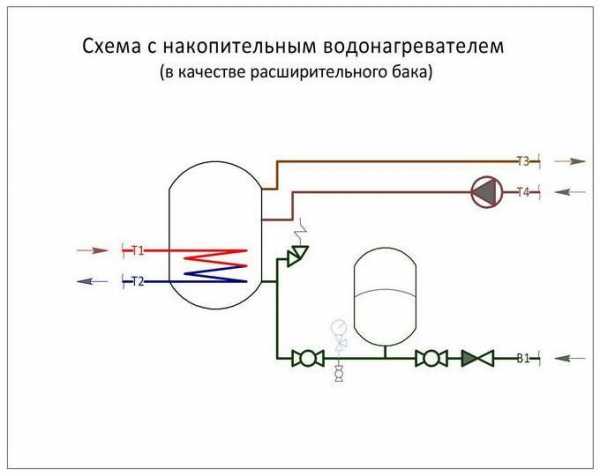 Для накопительного водонагревателя в схеме подключения гидроаккумулятор играет роль расширительного бака. Нагреваясь, вода расширяется, увеличивая объем в системе водоснабжения, а так как она не имеет свойства сжиматься, то самый минимальный рост объема в замкнутом пространстве увеличивает давление и может привести к разрушению элементов водонагревателя. Здесь тоже придет на помощь гидробак. Его объем напрямую будет зависеть и увеличиваться от увеличения объема воды в водонагревателе, повышения температуры нагреваемой воды и роста максимально допустимого давления в системе водопровода.