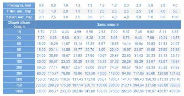 Согласно этой таблице, в 200 литровом гидроаккумуляторе при следующих установках реле давления: