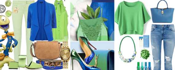 Сочетание синего и зеленого в одежде полностью раскрывает основной цвет: он оттеняет, углубляет, делает сочетание строже или придает ей игривость в зависимости от насыщенности синего. Но более гармонично оно смотрится в компании с белым, коричневым или бежевым, а также с элементами черного, золота или серебра.