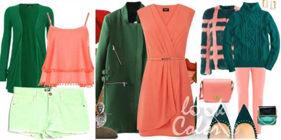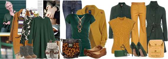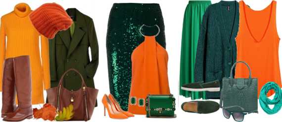 Сочетание зеленого и оранжевого в одежде – яркая, осенняя гамма, которая редко встречается самостоятельно, чаще к ней присоединяются коричневый, синий, фиолетовый, черный. Но если вы все же решитесь, то самым интересным вариантом будет теплые оттенки темно-зеленого с желто-оранжевым, апельсиновым, мандариновым.