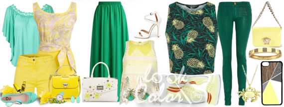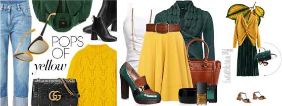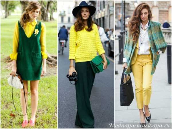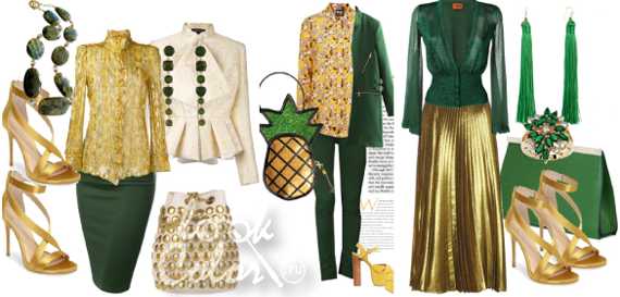 Сочетание желтого и зеленого в одежде – насыщенное, мягкое, теплое, оно столь же гармонично, как зелено-синяя комбинация. Светло-желтые перетекают в теплые светло-зеленые краски, с мятной, ментоловой, изумрудной зеленью вступают в тепло-холодный контраст. Насыщенно-желтые: банановые, горчичные придают шикарность, элегантность образу. Золото (оно тоже относится к желтому) делает тандем праздничным.
