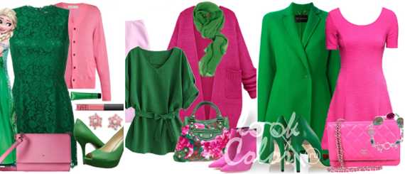 Сочетание зеленого и розового в одежде – милое, невесомое или насыщенное, чудесно привлекательное – все зависит от светлоты или насыщенности обоих цветов. Пастельная гамма из нежно-розового и бледно-зеленого будет смотреться еще нежнее с молочными, кремовыми тонами. Бледно-розовые с насыщенно-зелеными образуют выразительный, мягкий, привлекательный тандем, готовый принять в свое «общество» серый, коричневый.