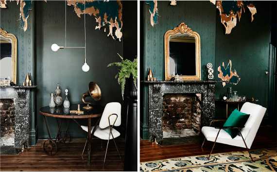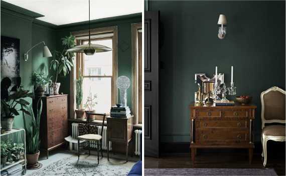 Темно-зеленый цвет добавляет веса в интерьерный дизайн. Это шик и устойчивость традиций, накопленного богатства, спокойствия и уверенности в завтрашнем дне. Поэтому частый спутник темного зеленого – золото, золотисто бежевый, коричневый, темно-синий. Акцентами служат красные, желтые, персиковые тона.