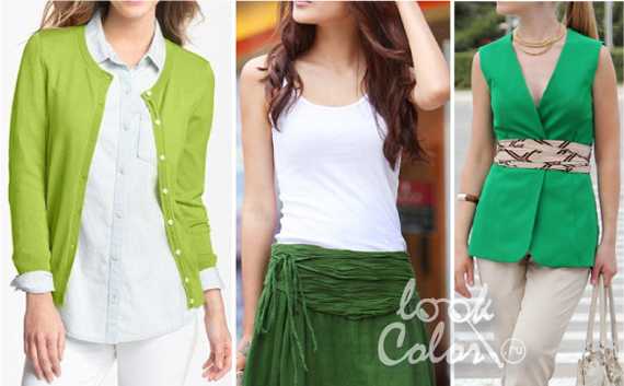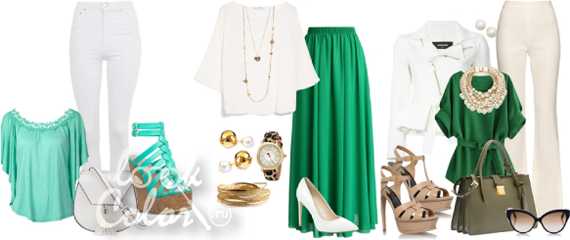 Но тут всё дело в пропорциях. Ведь можно к наряду, например, в бело-зелёной гамме подобрать красные аксессуары. Объём цветового пятна будет невелик и позволит комплекту выглядеть ярко, но не кричаще. Такой ансамбль вполне подойдёт и на каждый день.