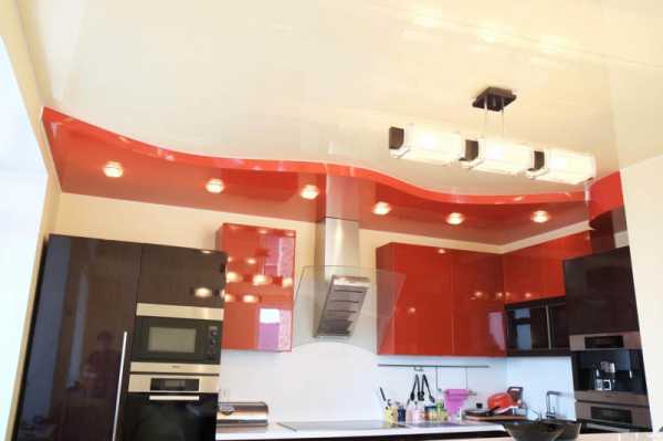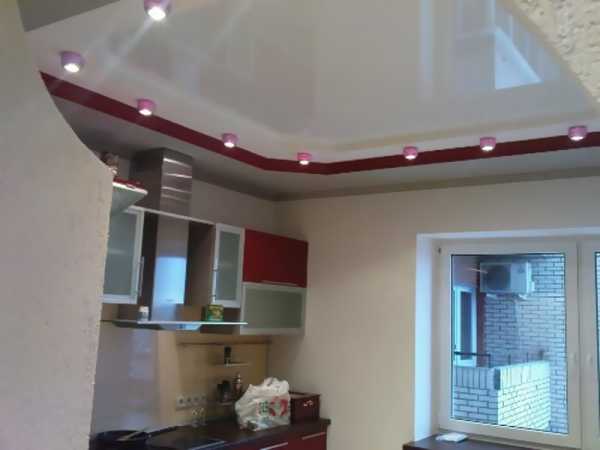 Натяжные потолки на кухне — неплохой выбор. Во всяком случае — красивый и современный. Хотя при их устройстве снова-таки потребуется «отобрать» некоторый объем: их монтируют на некотором расстоянии от перекрытия. Как и в случае с гипсокартонными потоками, натяжные тоже позволяют скрыть базовый потолок и инженерные коммуникации. Для освещения также могут использоваться точечные светильники, но другой конструкции.