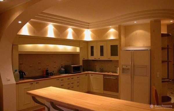 Конструкция потолка позволяет устанавливать точечные светильники, выбирая место их размещения по своему вкусу, что делает освещение на кухне более функциональным. Результат может быть очень красивым. Еще один положительный момент в том, что гипсокартон сделан из натуральных материалов — это два листа картона и прослойка гипса между ними.