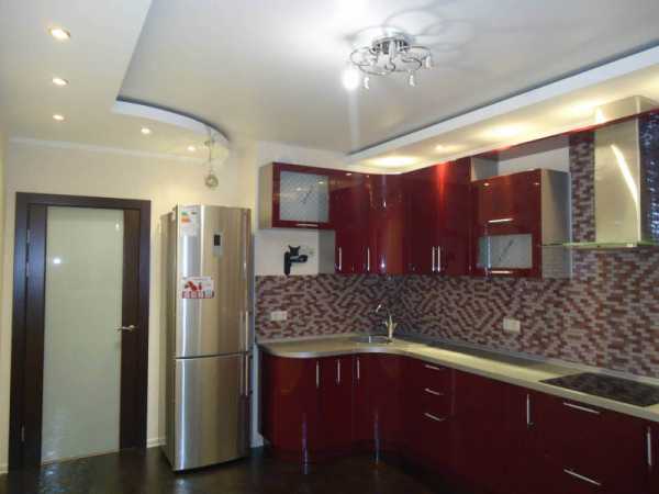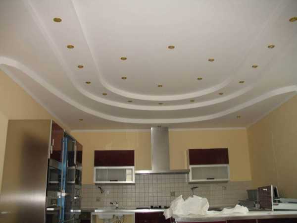 Если можно сделать потолок на кухне опустив его на несколько сантиметров, рассмотрите вариант подвесного потолка из гипсокартона. Этот способ отделки потолка хорош тем, что можно делать многоуровневые конструкции, которые полностью закрывают перекрытие. В зазор между основным и фальшь потолком можно уложить коммуникации — верткороба, проводку.