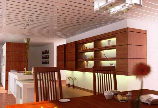 Как потолок на маленькой кухне, например, потолок в кухне в хрущевке, так и на большой можно отделать реечным навесным потолком. Эта система не боится перепадов температур, огнеупорна и влагоустойчива, конструкция состоит из алюминиевых тонких реек, также можно использовать зеркальные поверхности, которые визуально расширят помещение. Тип конструкции позволяет легко провести источники света в любой угол помещения. Если использовать зеркальную поверхность, то зрительно увеличивается площадь комнаты, в конструкцию устанавливаются светильники.