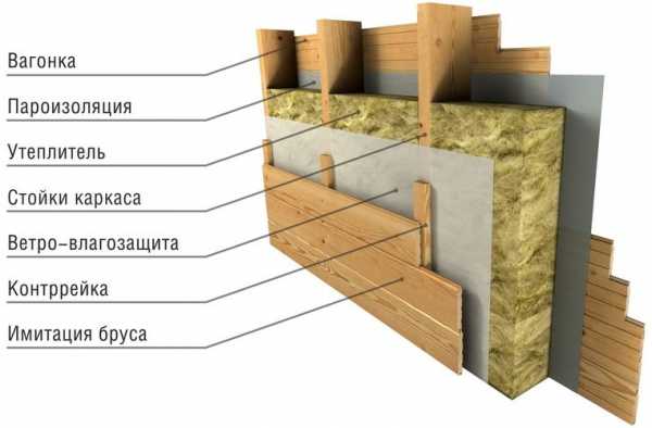 В самом начале выстраивается основная конструкция из бруса, которая постепенно наполняется теплоизоляционными материалами и обшивается защитными элементами.
