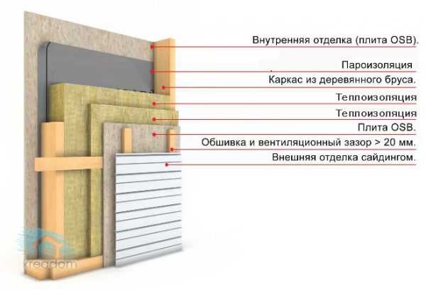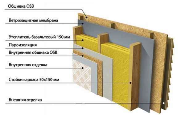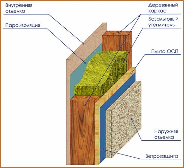 Типовая, многослойная схема утепления каркасных домовНаиболее распространенным вариантом современного утеплителя у строителей частных домов в РФ является базальтовая минвата. Она обладает массой преимуществ, среди которых: