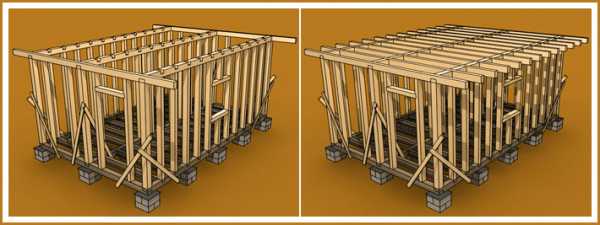 - Для пространственной жёсткости между стойками устанавливаются укосины. Если в небольших хозяйственных постройках их может заменить обшивка плитным материалом, то в одноэтажных каркасных домах для постоянного проживания установка укосин обязательна.
