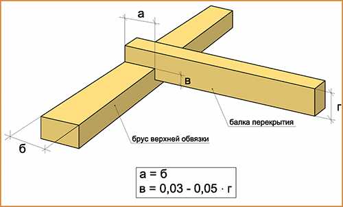 - Верхняя обвязка закрепляется на стойках при помощи прямых шипов. На нее монтируются балки перекрытия, на которые затем укладываются стропила.