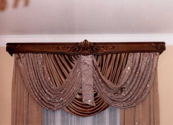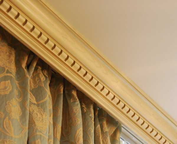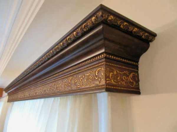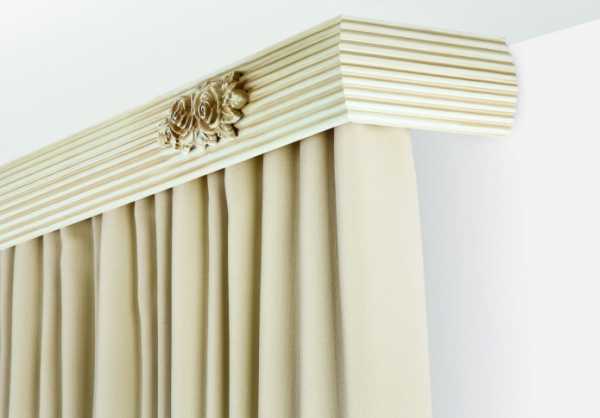 Когда занавески невозможно припрятать в нише, с целью сокрытия креплений используют багетный карниз, инкрустирующийся резьбой, имитирующий кожу и прочие материалы, а также шпонирующийся разными породами деревьев.