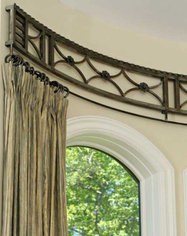 Когда окно имеет форму арки, нужно подбирать профильные карнизы. Поскольку карниз – элемент современного интерьера, выбирать его нужно, обращая внимание на размеры, оттенок, модель и материал.