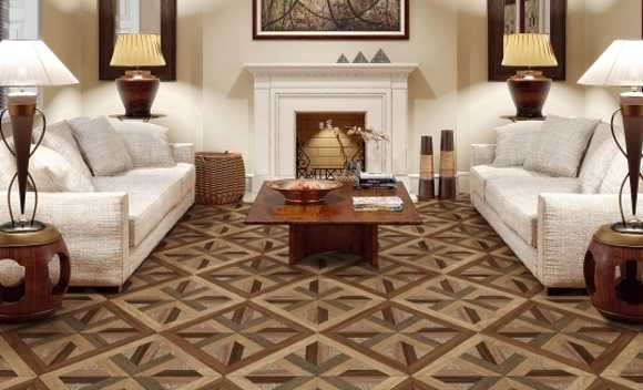 Нанесение на линолеум фактур натуральных материалов, например дерева или камня, позволяет привнести в интерьер оригинальность и гармонию.