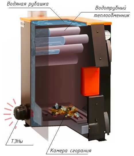 Конструкция напольных котлов этого типа не отличается сложностью. Над единственной топкой расположен бак с водой, через который проходит дымоход. В баке расположены ТЭНы, количество их может быть различным. Усовершенствованные модели котлов имеют дополнительную тепловую камеру, располагающуюся над баком. От нее по трубам, проложенным в баке, организуется отвод продуктов сгорания. Так увеличивается КПД работы теплового оборудования.