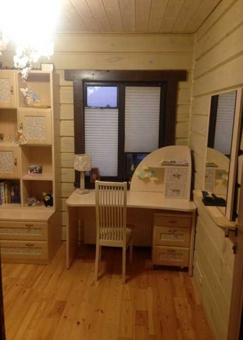 В этой комнате преобладает натуральное дерево, в разработке дизайна участвовала девочка 9 лет. Рабочее место у окна, слева расположен шкаф для хранения личных вещей, справа — зеркало, которое можно дополнить туалетным столиком.