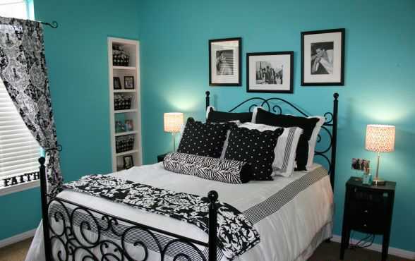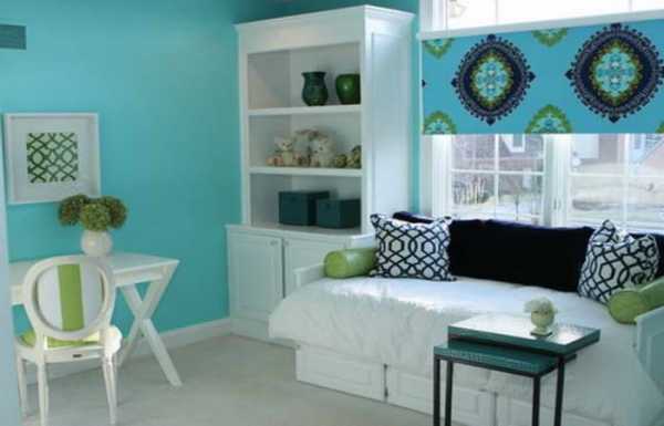 Сочетание белого и бирюзового цветов в интерьере спальни для девочек
