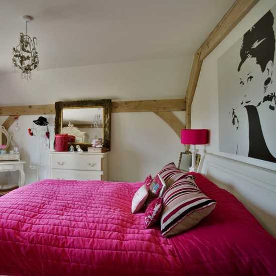 Он будет присутствовать на стенах, постельном белье и частично на обивке мебели. Не нужно загромождать пространство единственным цветом. Хоть он и доминирующий, его не должно быть слишком много.