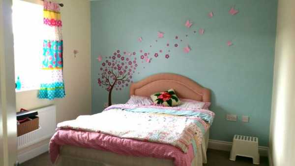 Нежная девичья комната для двух девочек разного возраста. Здесь мы видим минимальное количество мебели, в помещении преобладает голубой цвет. Яркий декор из бабочек оживляет пространство.