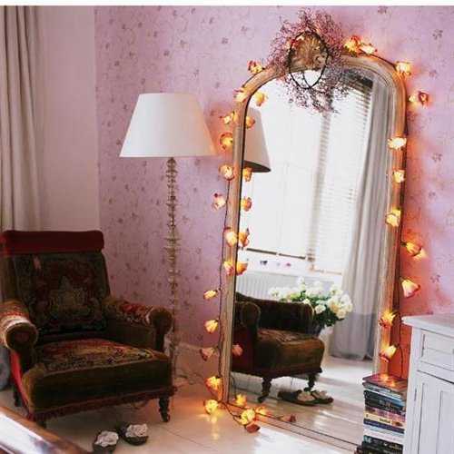 - Добавить в интерьер озорства и оригинальности можно при помощи различных гирлянд из фонариков или сердечек.