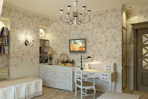 Стиль прованс. Цветочные обои в сочетании с пастельными оттенками и полом из древесины визуально увеличивают пространство, комната кажется просторной и светлой.
