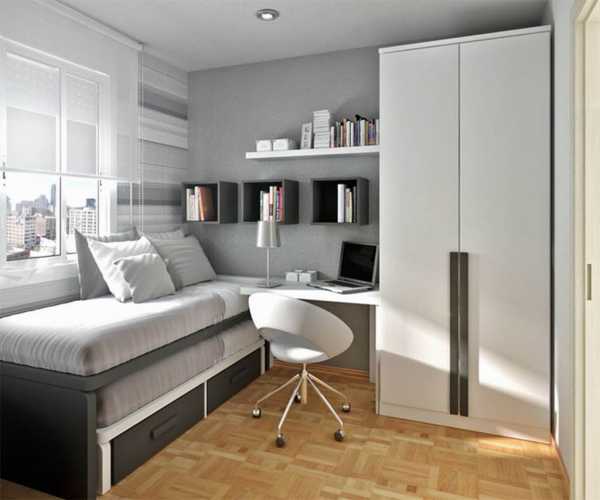Первым делом необходимо позаботиться о мебели, которая может включать в себя несколько функций. Например, можно приобрести двухъярусную кровать, где на первом этаже будет размещаться рабочее место, а на втором – собственно кровать. В кровати, как указывалось выше, можно предусмотреть ниши для одежды