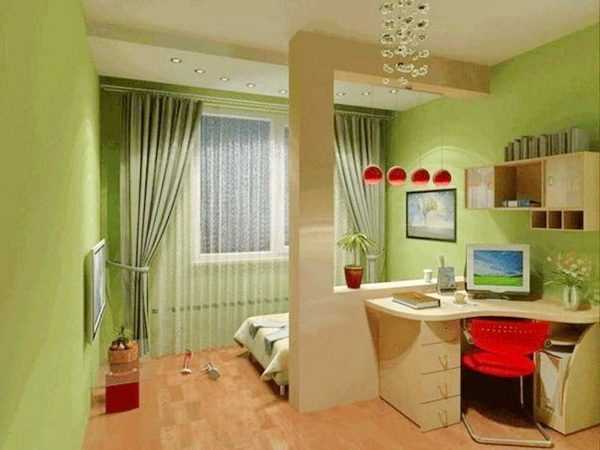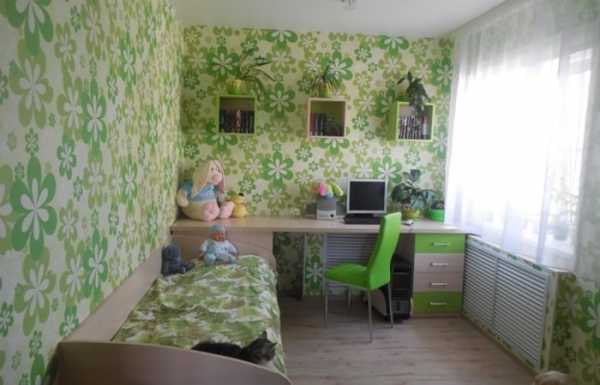 1) Сочное сочетание зеленого и белого оттенков визуально расширяют комнату. Классическая батарея скрыта за решеткой, рабочая зона и спальное место разграничены. Элегантные настенные полки позволяют хранить минимальный набор книг, не занимая пространство в небольшом помещении. Легкие занавески и точечные потолочные светильники дополняют дизайн, привносят легкость в атмосферу детской.