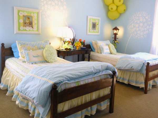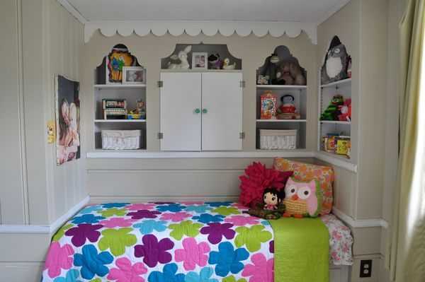 В комнате на 12 кв м размещаются детские вещи, книги, игрушки, одежда. Множество различных аксессуаров и мелочей, которые так любят девочки, можно хранить на полках, этажерках, в открытых шкафчиках. Развешиваются они по стенам, например, над спальным местом или учебным столом, в изголовье кровати. Если для детской, площадью 9 кв м, нужен стол для двоих, то лучшим вариантом станет столешница во всю стену с окном. По бокам от него можно разместить полки с книгами и разными учебными предметами.
