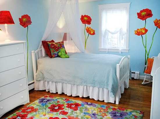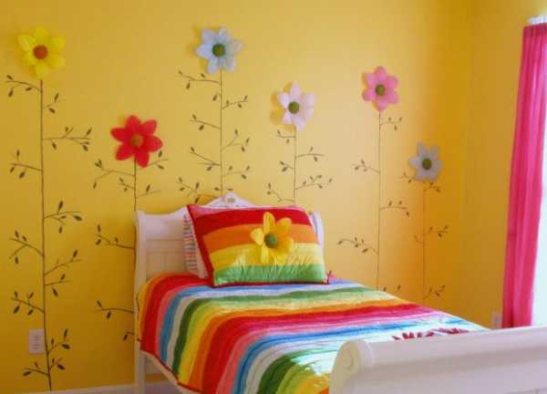 - Никто не требует от вас художественных подвигов – даже яркие примитивные цветы на голой стене будут выглядеть потрясающе! Особенно, если вы подберете подходящий по смыслу коврик или шторы.