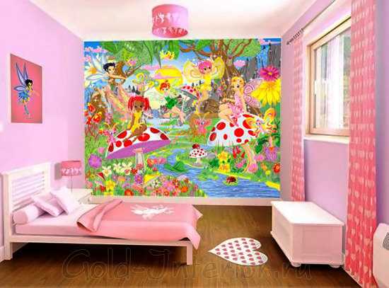 - Голые стены в детской комнате недопустимы, и самый простой способ украсить большой кусок разом – использовать фотообои. Можно найти уникальное изображение любимых сказочных героев дочери и напечатать картинку на заказ, либо купить что-то из готового ассортимента магазинов. Таким образом, можно украсить всю комнату для девочки 10-12 лет, полоску стены или небольшую нишу, а также сделать импровизированное изголовье кровати.