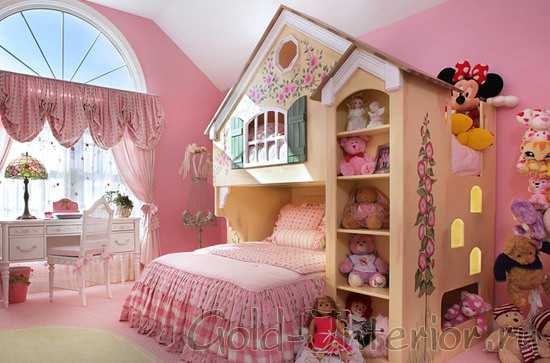 - Комнату для девочки 6-9 лет , созданную по аналогии с домиком для Барби, непременно оценит маленькая поклонница этой куклы. Изящная мебель и милые аксессуары – в таком же духе можно оформить интерьер комнаты для новорожденной девочки, естественно, смягчив оттенок розового.